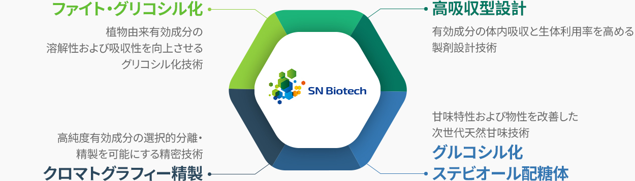 酵素反応により植物由来フラボノイドへ糖(グルコースなど)を結合させる独自技術です。糖の付加により、脂溶性の高いフラボノイドでも水溶性を獲得し、機能性が飛躍的に向上します。