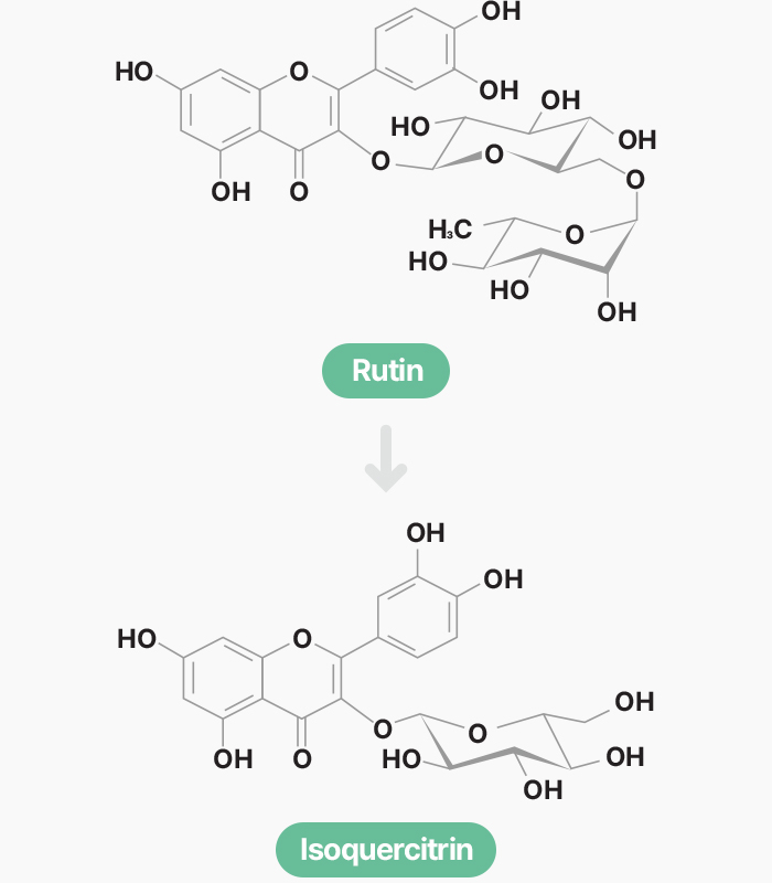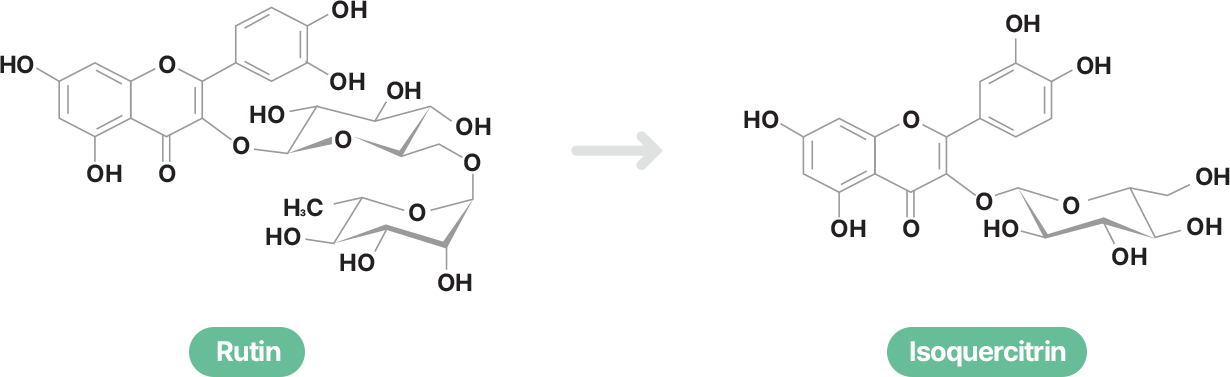 当社では、天然由来のルチン(Rutin)を出発原料とし、 バイオコンバージョン技術(生物転換技術)を応用して、高純度のイソクエルシトリンを製造しています。