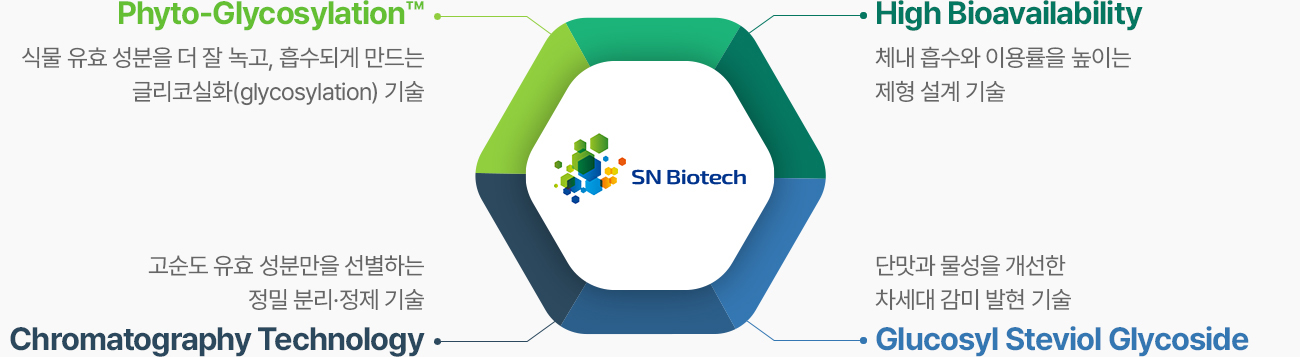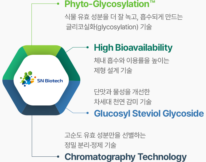 스테비올 배당체를 특이적으로 글리코실화(glycosylation)하고, 차별화된 정제 기술을 적용하여 스테비아 감미료의 품질을 한 단계 높이는 기술입니다.