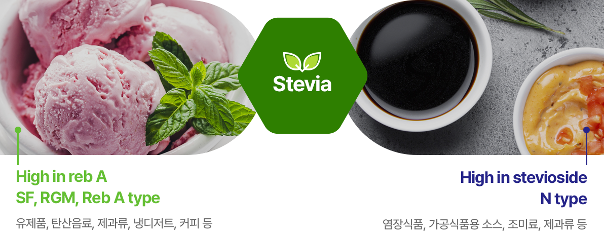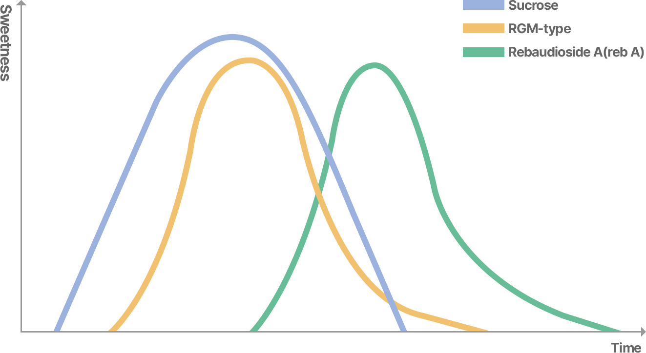 | 감미 특성 | 스테비아 특유의 단맛 | 마일드한 맛 | 설탕과 매우 유사한 맛 | 깨끗한 맛과 함께 쓴맛 |
