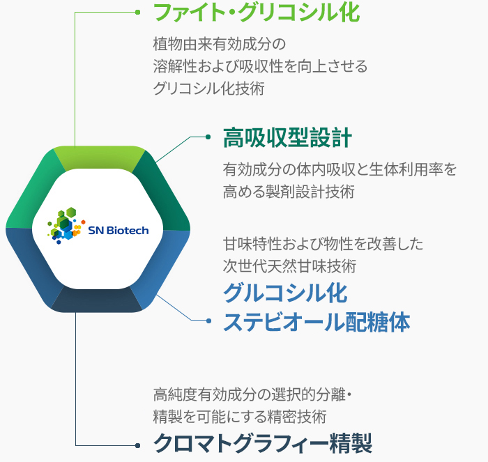 酵素反応により植物由来フラボノイドへ糖(グルコースなど)を結合させる独自技術です。糖の付加により、脂溶性の高いフラボノイドでも水溶性を獲得し、機能性が飛躍的に向上します。